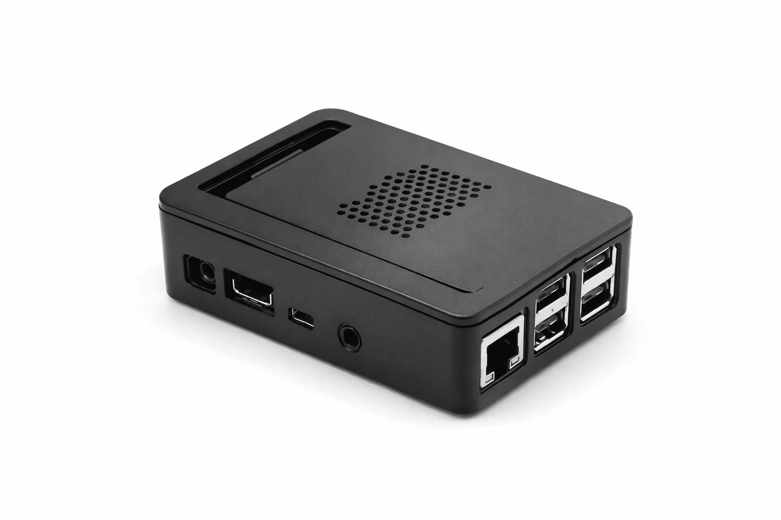 Чорний пластиковий корпус для Raspberry Pi, з вентиляційними отворами для охолодження та доступом до всіх портів.